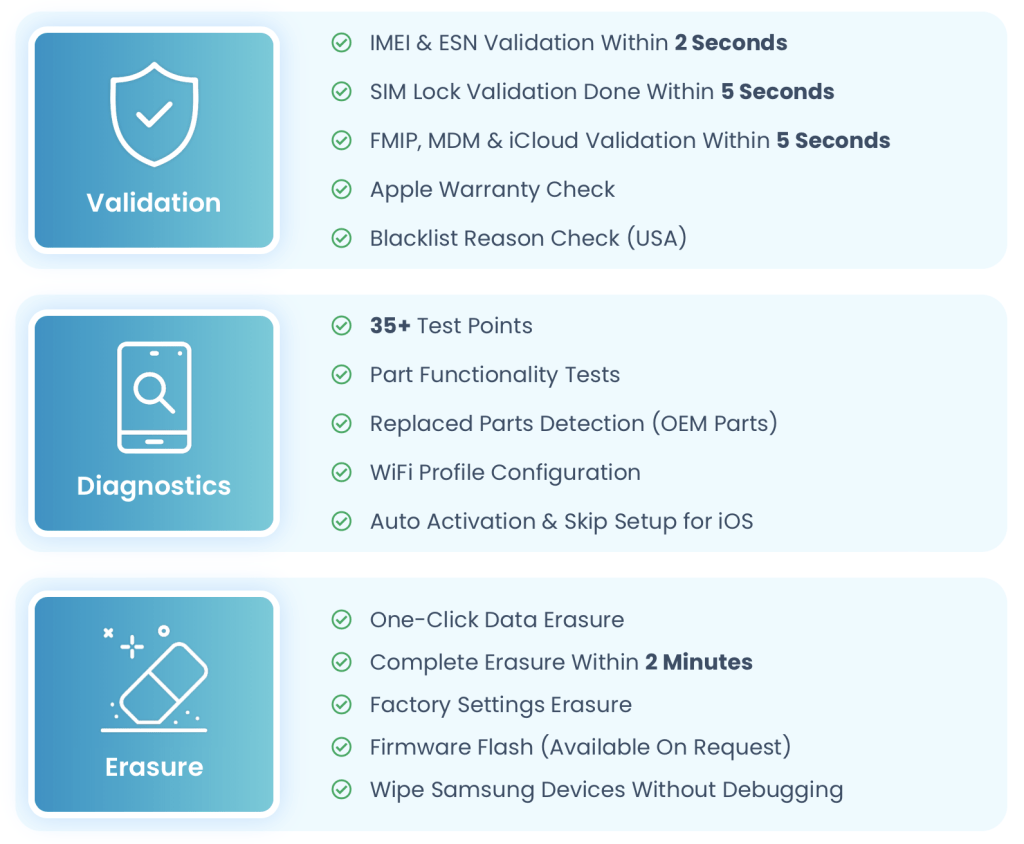 We test our used mobile phone with Project FoneD software; the fastest, accurate and reliable validation, diagnostics & erasure sevices which provides holistic value and assurance for the used mobile phone industry.